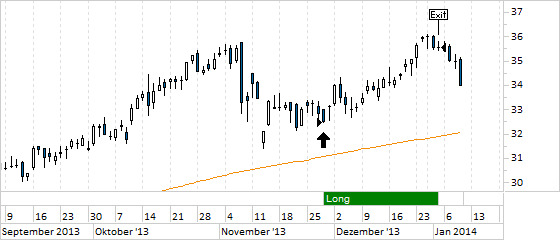 (Prime Quants) – Das Handelssystem pqRenditeFaktor hat am 27. November 2013 ein Kaufsignal für ProSiebenSAT.1 generiert. Gemäß den Systembedingungen wurde daher am Folgetag zur Handelseröffnung (28. November) eine Long-Position (WKN: DZK7KH) zu einem Aktienkurs von 33,00 Euro aufgebaut. 20 Handelstage später wurde ein Verkaufssignal ausgelöst, sodass die Position zu einem Kurs von 35,58 Euro wieder geschlossenen wurde. Dank der Hebelwirkung des Zertifikats (Hebel 3) konnten sich die Leser des Signalservices pqRenditeFaktor so über einen Gewinn von 23,45 Prozent freuen.