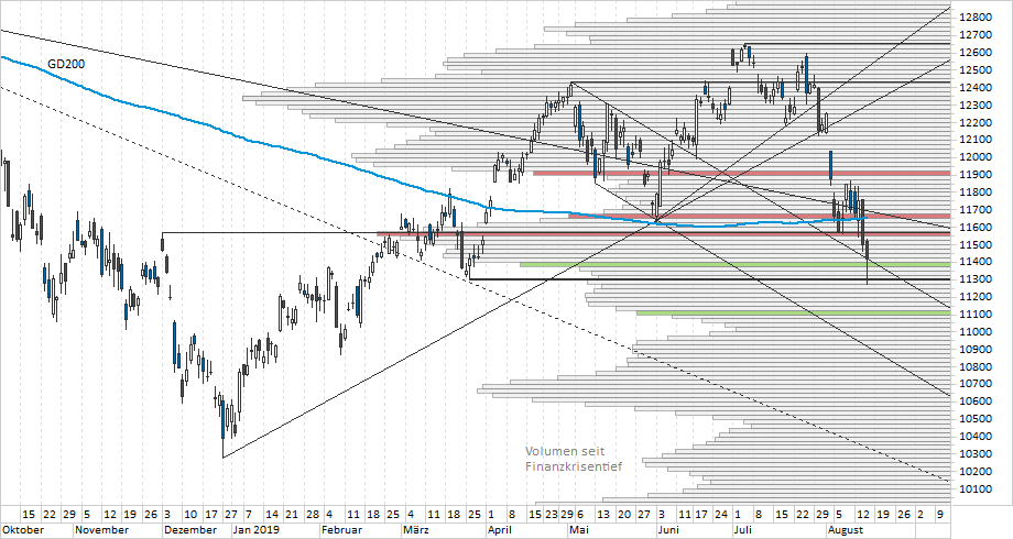 Interessanterweise hat sich Donald Trump noch gar nicht zu dem (vorrangig von ihm verursachten) Kursrutsch an den Märkten geäußert. Zur Erinnerung: Mit dem von ihm angezettelten Handelskrieg (den zu gewinnen er ja bekanntlich für eine der leichteren Aufgaben hält) leistet der US-Präsident einer möglichen Rezession eher Vorschub. Pikant daran: Ausgerechnet im Wahljahr 2020 könnte die US-Wirtschaft anfangen zu schrumpfen. Die Zeit bis dahin vertreiben wir uns aber mit einem Blick auf die Kursziele der Oberseite, denn die wurden in dieser Woche ordentlich durchgemischt. Für den DAX heißt es jetzt nämlich zuallererst, den Bremsbereich bei 11.567/11.600 zu überwinden und im Anschluss den GD200 bei 11.650 zurückzuerobern. Dann erst würde die Eindämmungslinie bei 11.750 wieder ins Blickfeld rücken, und oberhalb davon würde es erneut um den hartnäckigen Widerstand zwischen 11.823 und 11.869 Punkten gehen. Ach ja, und darüber würde sogar die 12.000er-Marke noch einmal als Zielzone infrage kommen…kaum zu glauben, dass es erst zwei Wochen her ist, seit wir dieses Kurslevel nach unten verlassen mussten!